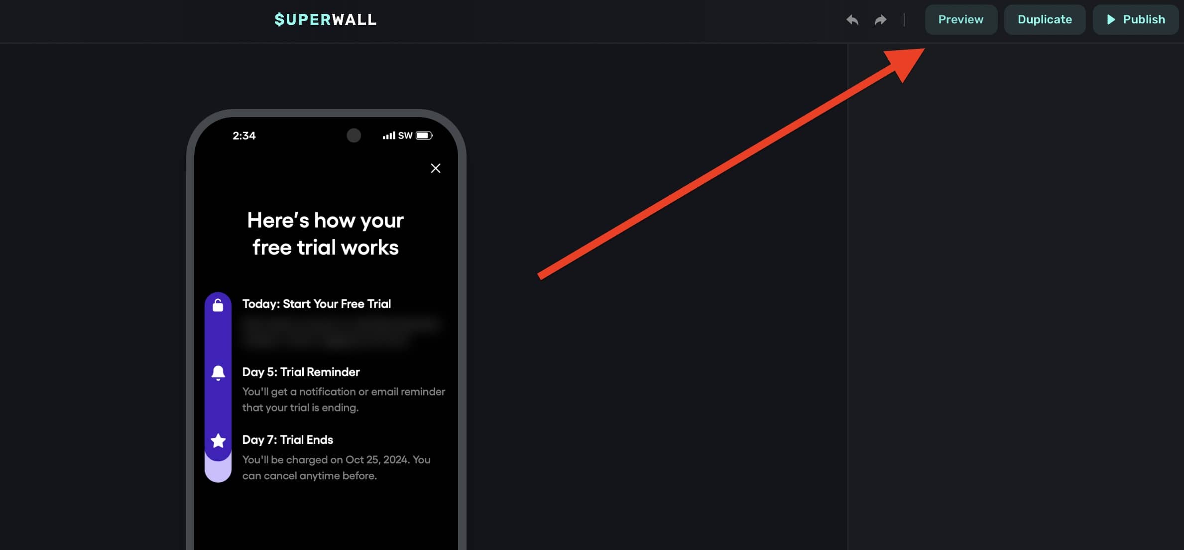 - Open the paywall editor and click "Preview":