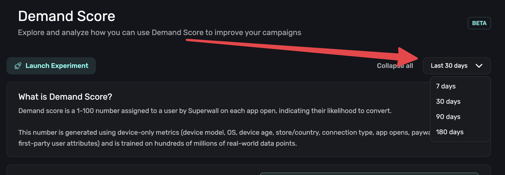 Demand Score is a 1-100 value assigned to each user by Superwall, indicating their likelihood to convert. Use it to understand your audience and target users with the right offers.