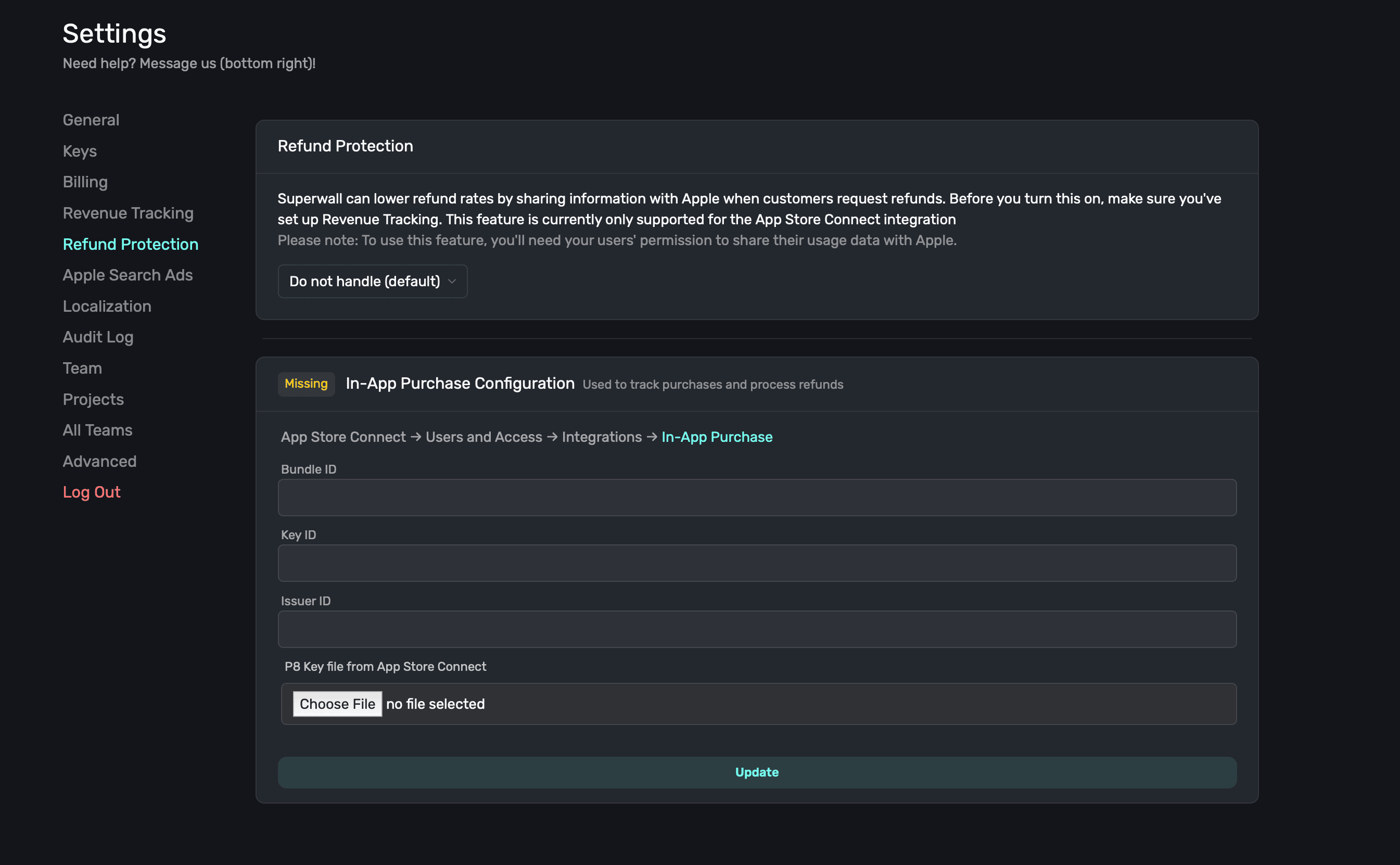 In the Refund Protection section under Settings, you can configure settings to better equip Apple to handle refund requests from your iOS app. This could result in fewer refunds being issued based on the context you provide Apple: