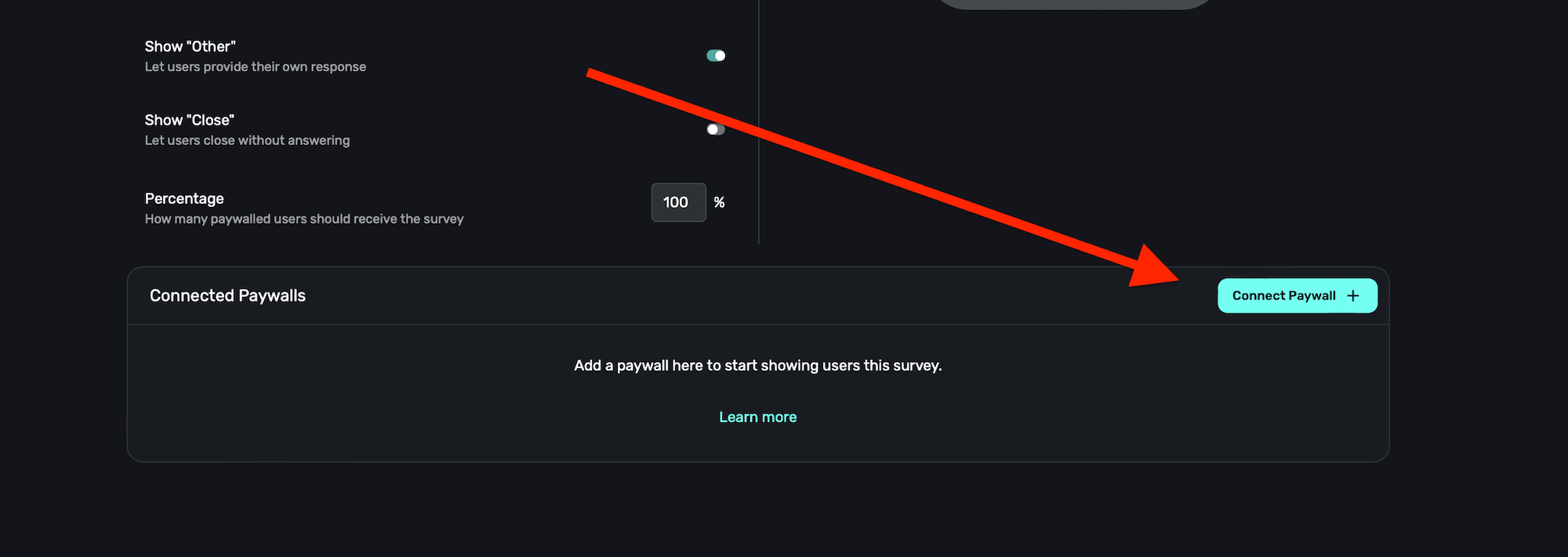 After you've selected a paywall, click the Connect button and you're all set. From there, each user will only see the survey once per paywall.