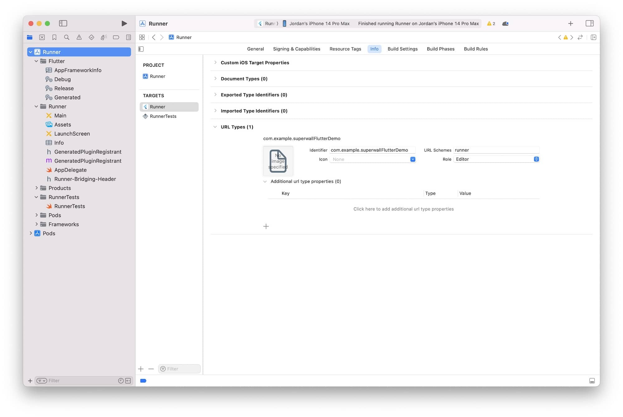 $ open ios/Runner.xcworkspaceIn its info.plist, add a row called URL Types. Expand the automatically created Item 0, and inside the URL identifier value field, type your Bundle ID, e.g., com.superwall.Superwall-SwiftUI. Add another row to Item 0 called URL Schemes and set its Item 0 to runner to match Flutter's Xcode project name.
