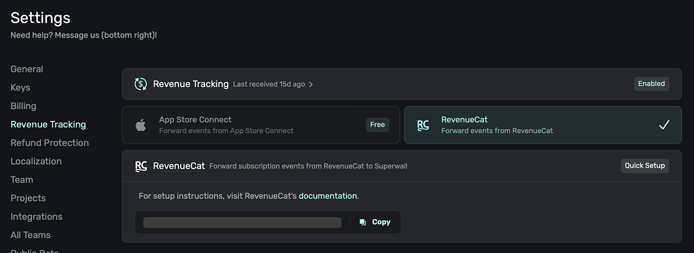 The Server Secret is different from your Public Key, which can be found in the general Keys section. Make sure you're specifically in the Revenue Tracking section under Settings to find the Server Secret for RevenueCat integration.