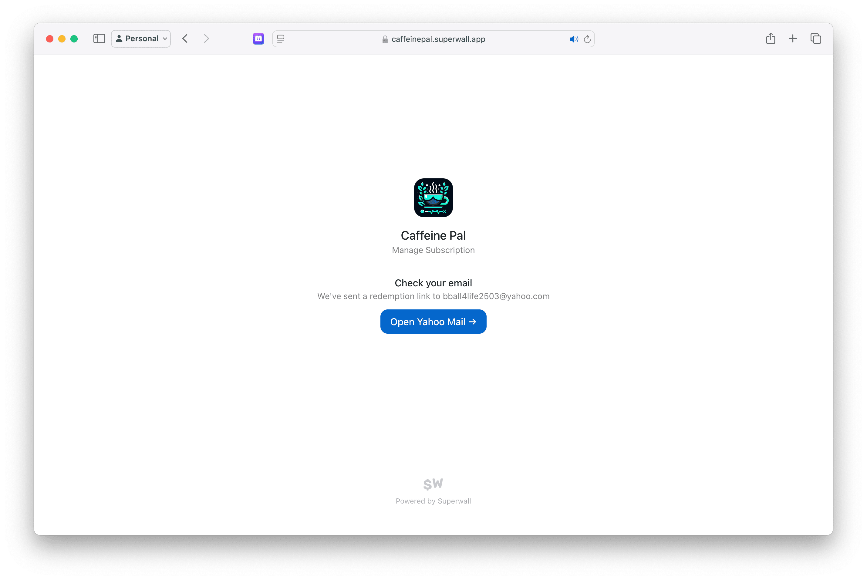 For the above example, the URL would be https://caffeinepal.superwall.app/manage. After entering their email, they will receive a link to manage their subscription, update payment methods, view their billing history, and more: